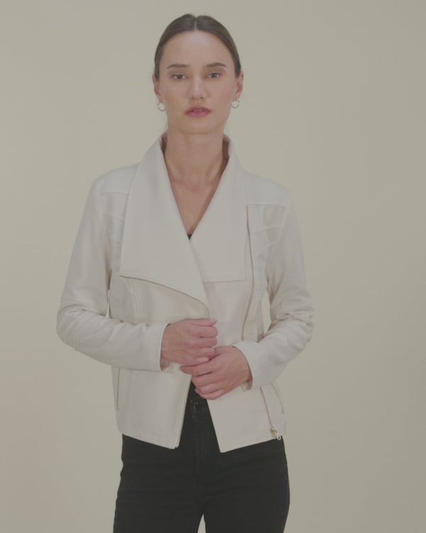 An adaptable silhouette designed for ease. Cut from our signature Liquid Leather knit with a soft matte finish, this jacket is defined by an asymmetrical zip that extends to the neckline, shifting effortlessly between high collar, fold-over, or open drape. Considered seaming and subtle structure contour the body, while silver zip pockets add utility. Lightweight and breathable, the stretch interior allows for comfort without compromising shape. Vegan-friendly by design, it balances versatility with refinement.