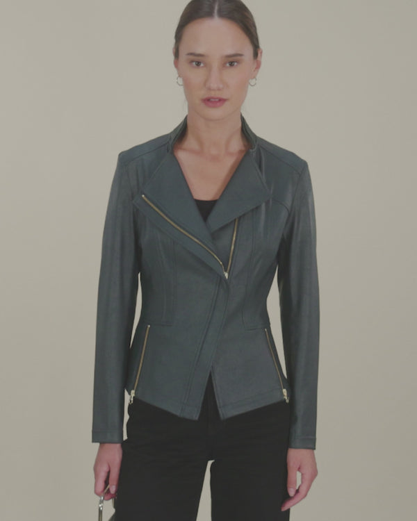 A refined outer layer with soft structure and quiet detail. This tailored jacket is crafted from Liquid Leather, a lightweight stretch knit with a smooth matte finish and a supple, lambskin-like hand. Designed with an upright collar, notched lapel, and asymmetrical zip closure, it shapes the body through subtle seaming at the front and back. Faux zipper slits add restrained utility.