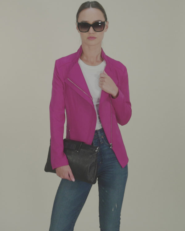 Our Magenta color is a warm, vibrant, mid-tone pink shade with plum undertones, offering a rich contrast to the jacket’s minimalist structure. The interior is fully lined in breathable knit for comfort, flexibility, and a close, flattering fit.
