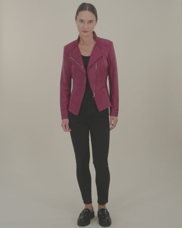 A refined outer layer with soft structure and quiet detail. This tailored jacket is crafted from Liquid Leather, a lightweight stretch knit with a smooth matte finish and a supple, lambskin-like hand. Designed with an upright collar, notched lapel, and asymmetrical zip closure, it shapes the body through subtle seaming at the front and back. Faux zipper slits add restrained utility.